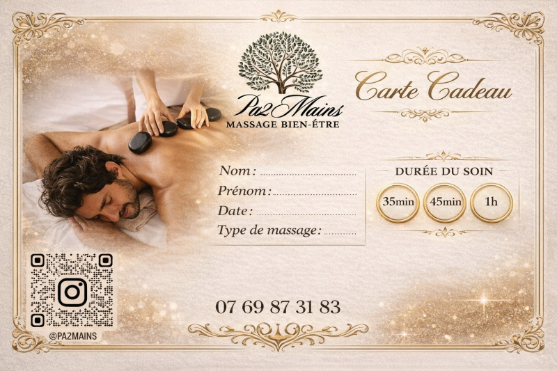 Pas d'idée pour un cadeau ? Ne chercher plus !   Voici les cartes cadeaux prêtes à remplir avec le soin que vous souhaitez offrir et la durée de la prestation.